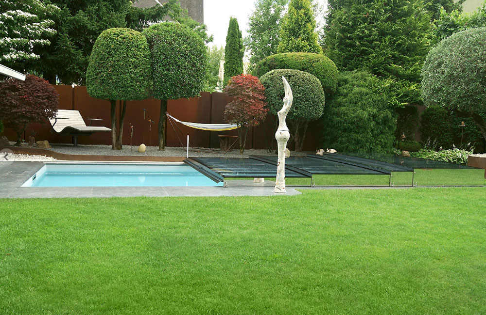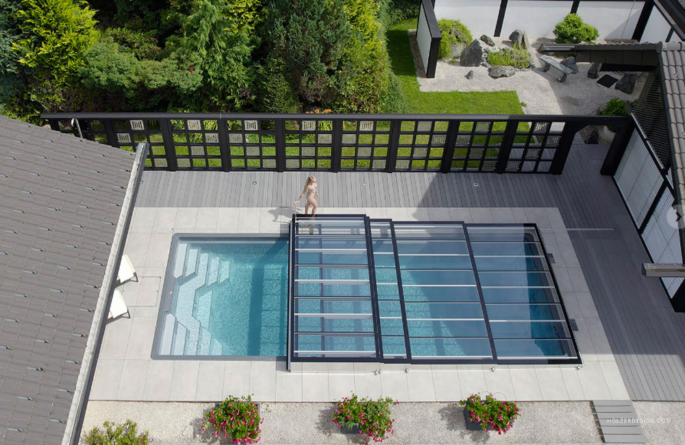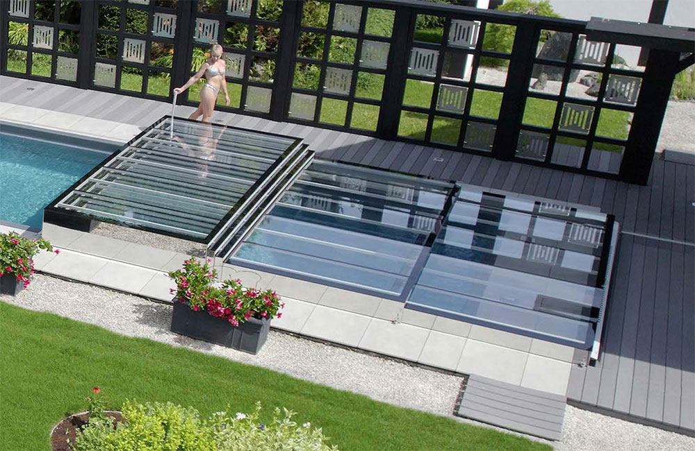 Die E2G setzt mit ihrer einzigartigen Ganzglasoptik Maßstäbe als Designerstück unter den Flachabdeckungen. Diese exklusive Poolabdeckung kombiniert die Ästhetik von Poolüberdachungen mit isolierendem Luftpolster.