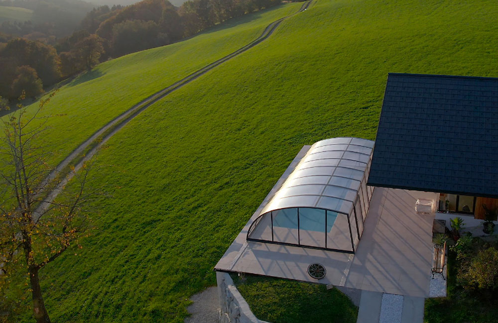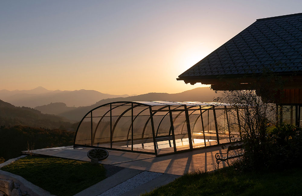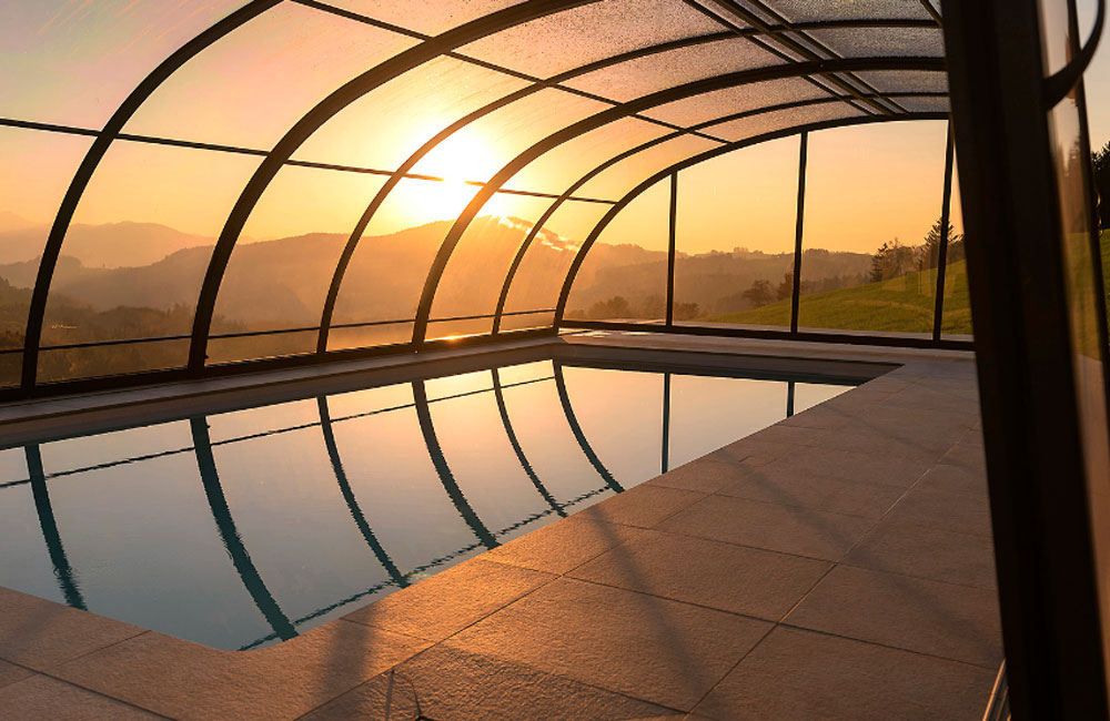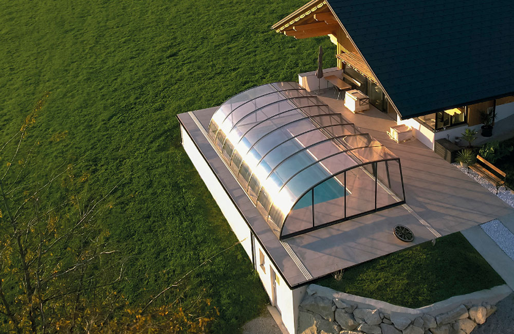 Der großzügige Innenraum verfügt über einen erhöhten Bereich entlang der Längsseite des Pools, was ausreichend Platz für einen angenehmen Geh- und Liegebereich schafft. Selbst kühlere Tage können Sie so unbeschwert am Pool in vollen Zügen genießen.