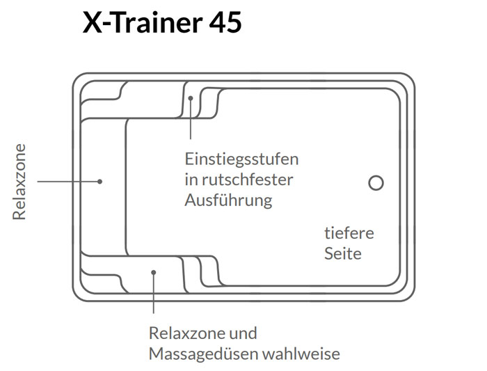 Der X-Trainer 45 SB ist die ideale Wahl für alle, die Training, Entspannung und Design in einem kompakten Pool vereinen möchten. Trotz seiner überschaubaren Größe bietet er überraschend viel Platz für Bewegung im Wasser und eignet sich perfekt für sportliche Aktivitäten ebenso wie für entspannte Momente.