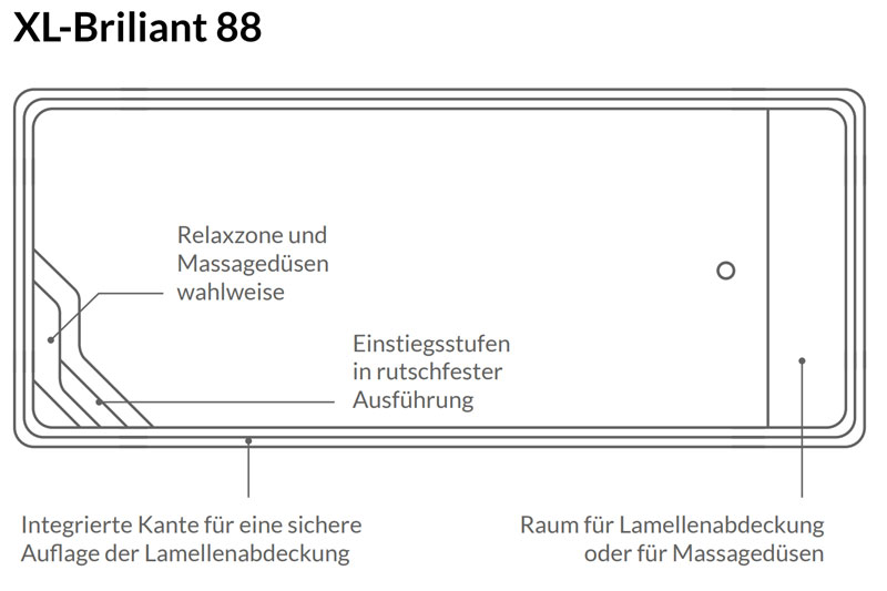 Der XL Briliant 88 steht für großzügige Dimensionen und richtet sich an alle, die ihren Pool aktiv nutzen und dabei keine Kompromisse eingehen möchten. Die klare, rechteckige Form sorgt für eine moderne, strukturierte Optik und unterstreicht den hochwertigen Charakter des Pools.