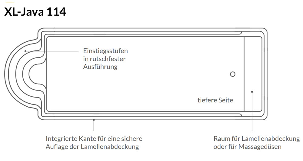 Auch technisch überzeugt der XL Java 114 SB mit durchdachten Details und hoher Funktionalität. Die integrierte Kante für eine optionale Lamellenabdeckung sorgt für Sicherheit und Effizienz, während zusätzliche Ausstattungsmöglichkeiten wie Massagedüsen oder Gegenstromanlagen den Pool individuell erweiterbar machen. So lässt sich das Badeerlebnis perfekt an persönliche Wünsche anpassen.